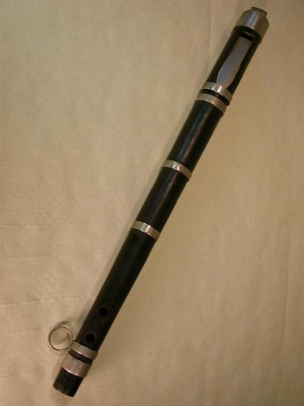 Duct flute with three fingerholes, conical body of one piece of wood stained in black.